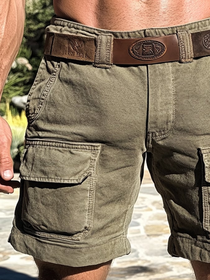 Men's Vintage Outdoor Pocket Functional Leather Embossed Design Cargo Shorts