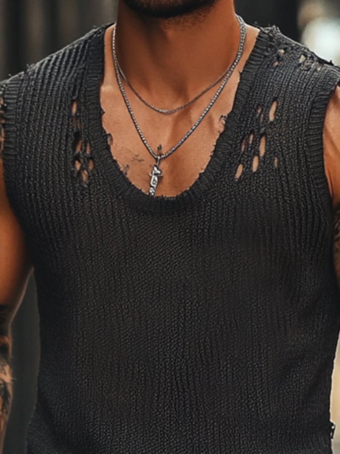 A Light And Thin Knitted Short-Sleeved Top With Irregular Perforated Fur For Men