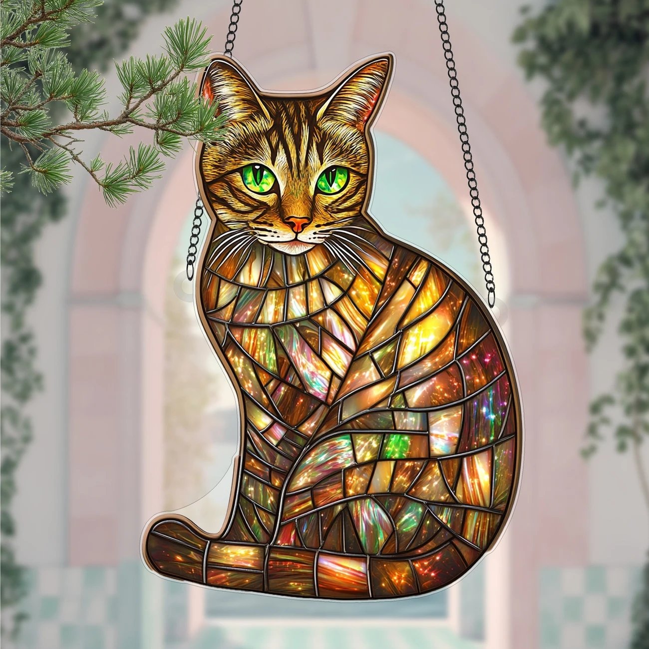 - Enchanting Cat Design – With lifelike emerald green eyes and graceful posture, this ornament captures the soul of a tabby cat in mesmerizing detail. The colorful, textured segments reflect a rich inner glow.