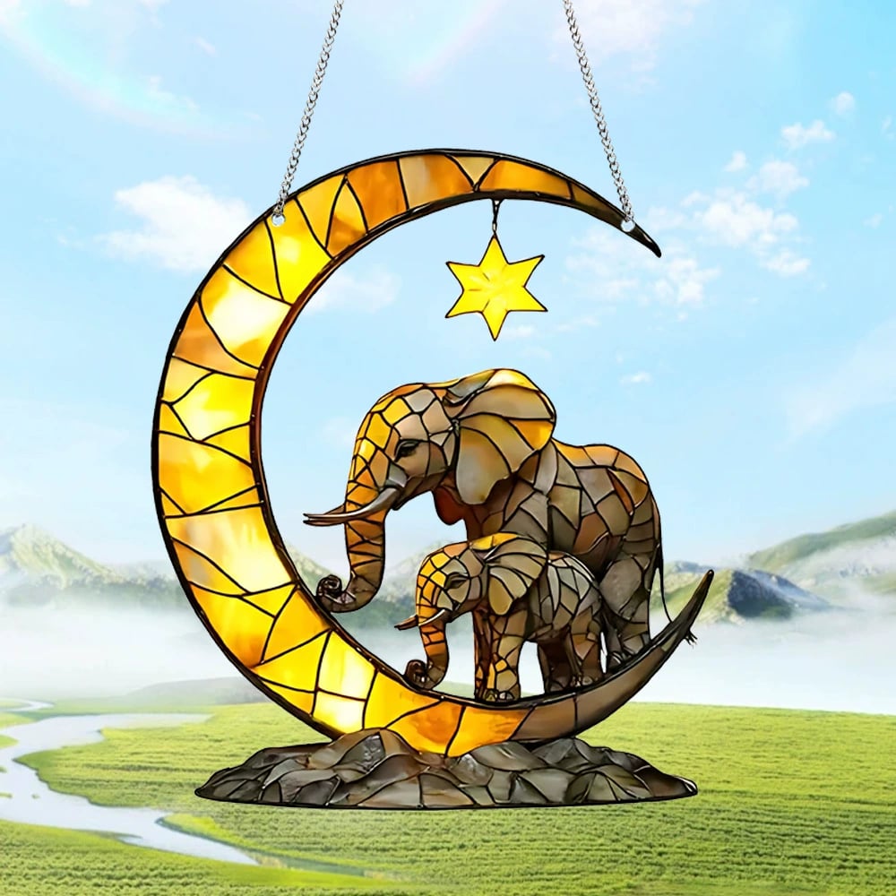Add a touch of celestial beauty to your space with this Moon & Elephants Stained Art Ornament. Featuring a golden moon with a six-pointed star and a majestic elephant with its baby, this piece represents strength, unity, and cosmic peace.